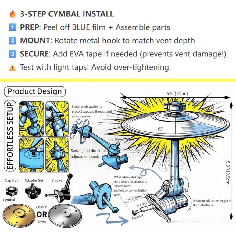 【Important Notes】For safety, use only when the vehicle is stationary. Keep your focus on the road at all times.The cymbal is designed for light tapping—striking too hard may cause dents or deformation. Treat it like a fun accessory, not a full drum kit!