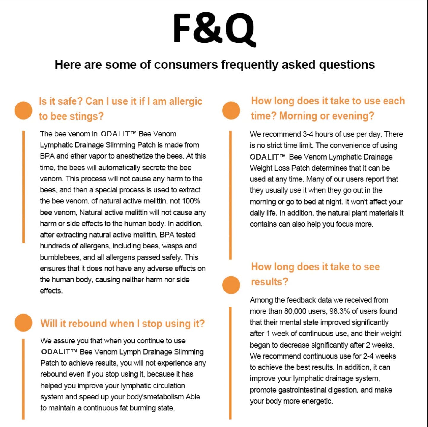 I have combined various botanical ingredients, long known for their benefits to the lymphatic system and body metabolism, to create ODALIT™ Bee Venom Lymphatic Drainage Slimming Patch. Experimental evidence indicates that this lymphatic drainage slimming patch is the optimal choice for improving the lymphatic system. The blend of these natural botanical ingredients, coupled with the potent properties of bee venom, offers a groundbreaking solution for swiftly addressing metabolic disorders and lymphatic congestion issues.